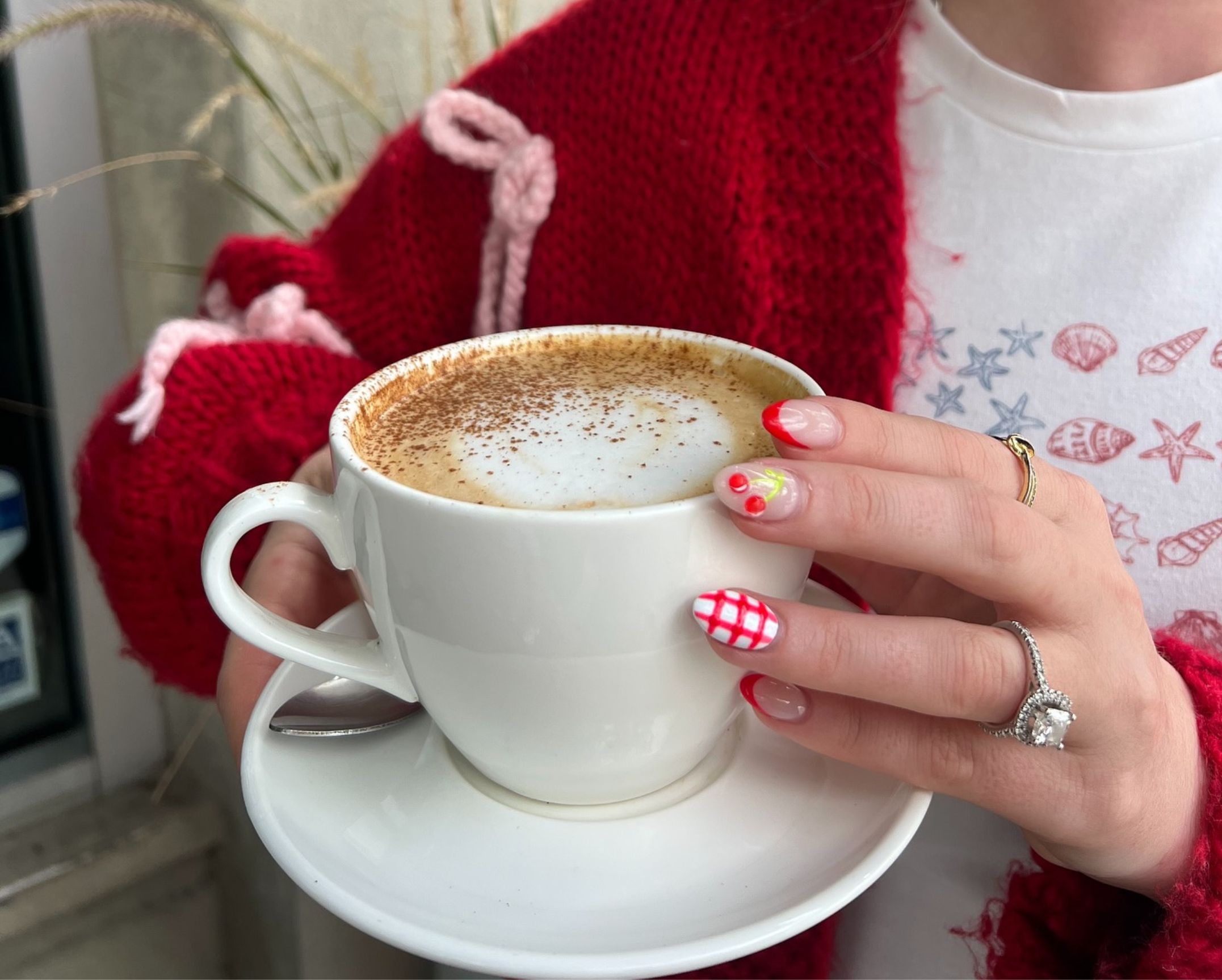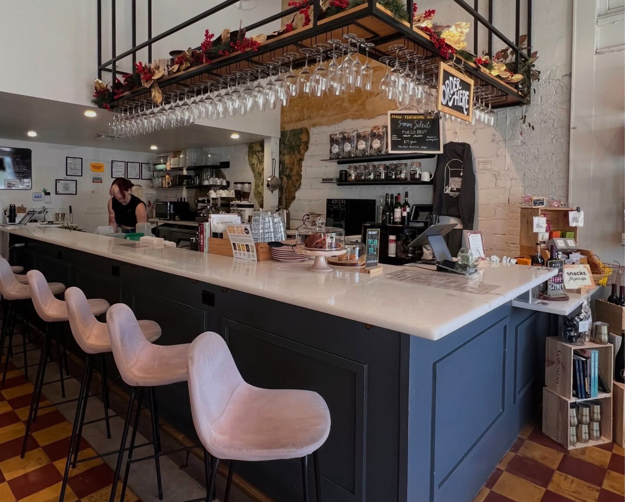 The seasonal house-made Strawberry Pistachio Latte or the new house-made Vanilla Bean Latte, plus classic espresso drinks, cold brew, and wine selections. They also offer decaf espresso for all coffee beverages.