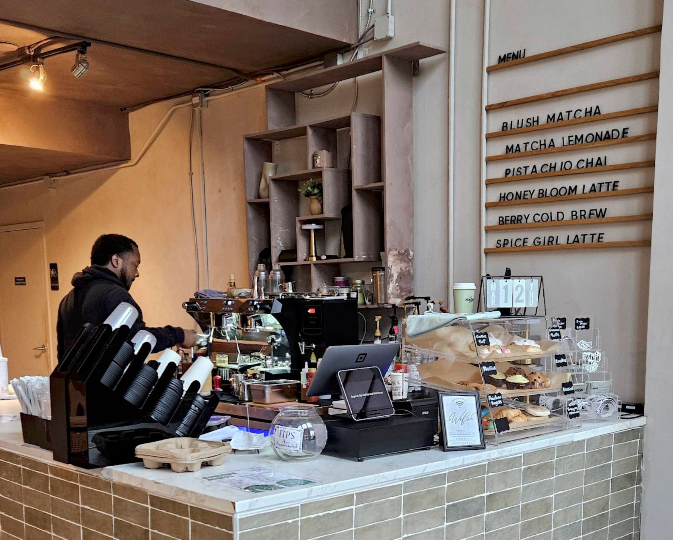 The Honey Bloom Latte, Blush Matcha, seasonal specialty lattes made with house crafted syrups, and sweet treats like cookies, cinnamon rolls, and pastries.